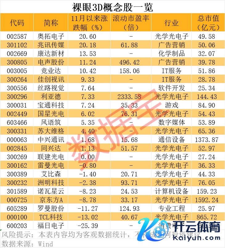 据证券时报·数据宝统计,布局裸眼3D的A股上市公司共有23家,主要齐集在光学光电子行业,其他还有告白营销、数字媒体等行业上市公司。从股价上来看,意见股11月以来平均飞腾2.38%,其中奥拓电子、兆讯传媒、康达新材、电声股份、竞业达累计涨幅超过10%。
