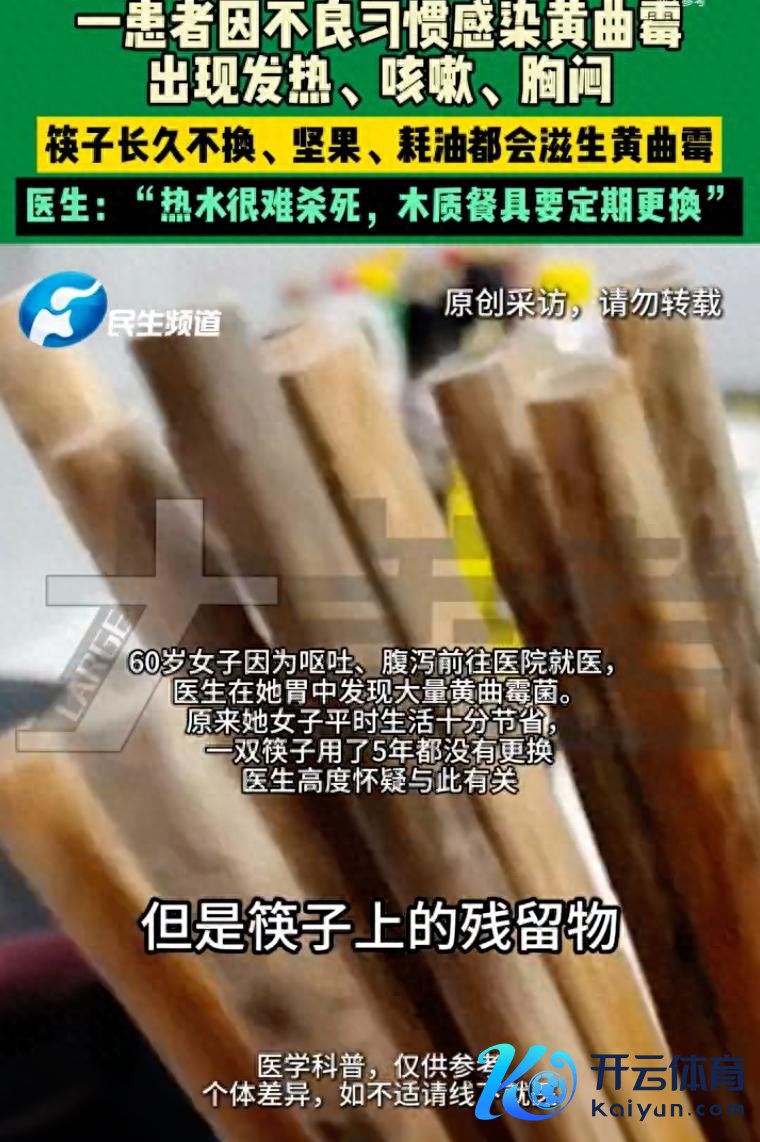 7月28日(采访),郑州一60岁女子因为吐逆、泻肚前去病院就医,大夫在她胃中发现多数黄曲霉菌。探寻病因得知,该女子泛泛活命相称勤俭,一对筷子用了5年齐莫得更换,高度怀疑与此关系。好在进程休养,该女子如故康复出院。