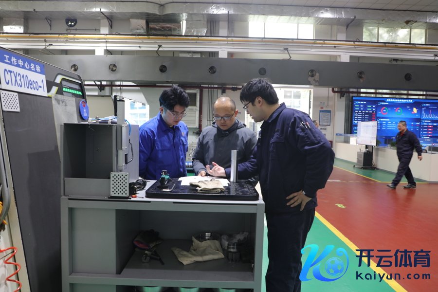 办事中心旁,三位技能工东谈主正围桌接头某一零件的加工参数。