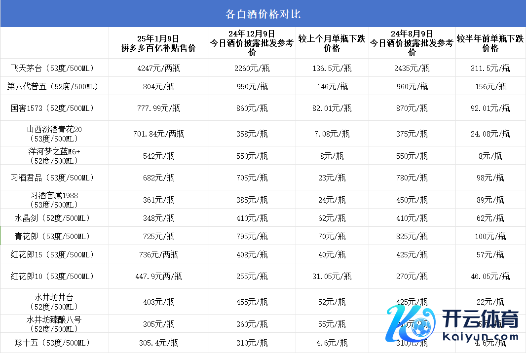 1月9日,大河财立方记者了解到,在拼多多平台百亿补贴中,闻明酒企的中枢大单品出现不同进度跌价。其中,山西汾酒的青花20、珍酒的十五价钱进展坚挺开云体育,全年下落幅度较小;第八代普五、国窖1573、水晶剑、水井坊井台、水井坊臻酿八号近一个月售价下落较大;郎酒的青花郎、红花郎10、红花郎15价钱则握续走低。