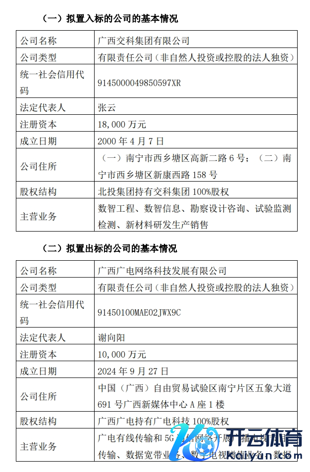 拟置出方针公司广电科技征战于2024年9月,注册成本1亿元,主贸易务为广电有线传输和5G通讯网络开展播送电视节目传输、数据宽带业务、数字电视升值业务等,系广西广电的全资子公司。