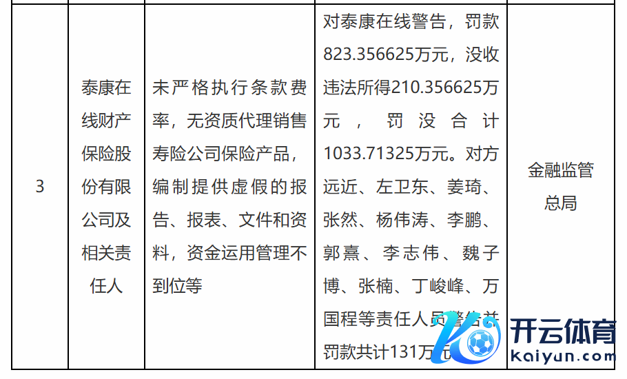 金融监督科罚总局对泰康在线给予警告,处罚金823.36万元,充公行恶所得210.36万元,罚没统共1033.71万元,对方遐迩、左卫东、姜琦、张然、杨伟涛、李鹏、郭熹、李志伟、魏子博、张楠、丁峻峰、万国程等包袱东说念主员给予警告并罚金共计131万元。