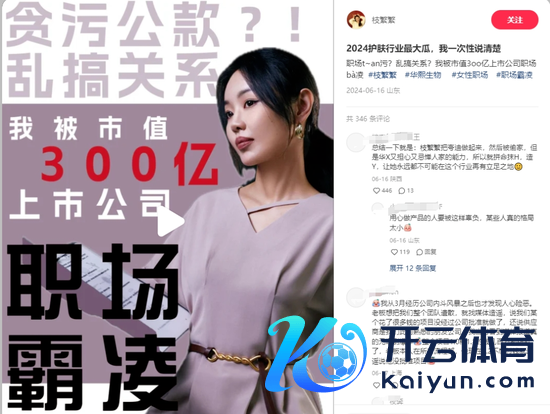 具体来看,2024年6月16日,也曾指导华熙生物旗劣品牌夸迪进入10亿级国货阵营的前主办东说念主枝繁繁(程菲),在酬酢媒体平台发布视频称,“2024护肤行业最大瓜,我一次性确认晰。职场铩羽?乱搞关系?我被市值300亿上市公司职场霸凌。”