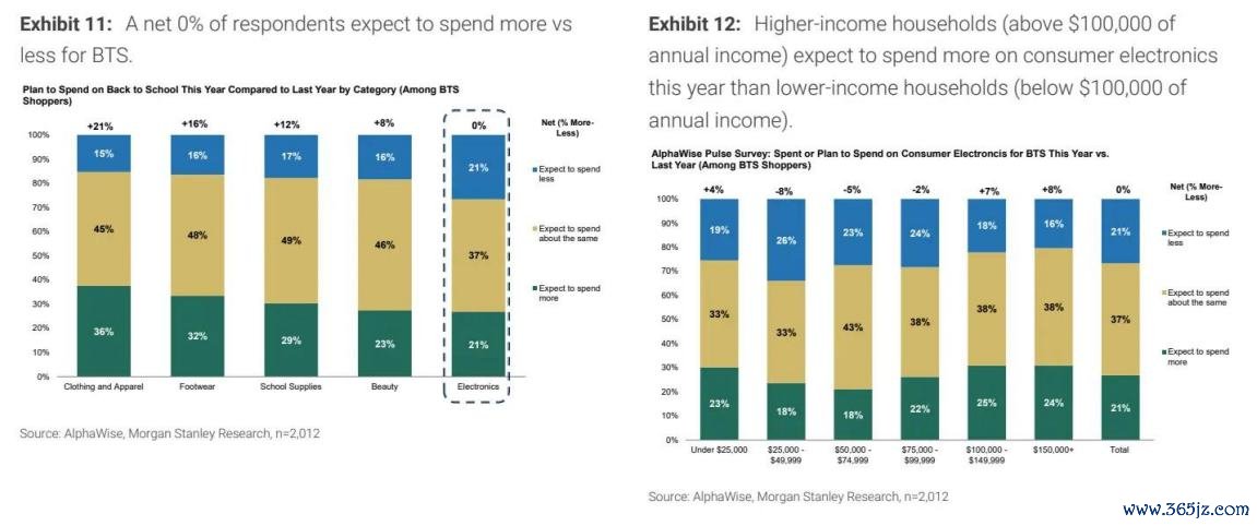 但滥用者对返校季电子产物的支拨意向暴表示一定的严慎。探望暴露,0%的受访者瞻望在行将到来的返校季加多而非减少电子产物支拨,这一信号相对严慎。比较之下,服装、鞋类、学校用品和好意思容产物的返校季净支拨意向更为积极,且与2024年滥用者电子产物返校支拨意向的来源(+5%)比较也有差距。不外,高收入滥用者对返校季电子产物的支拨意向呈积极态势,而低收入群体则为负面。