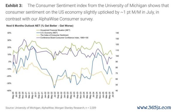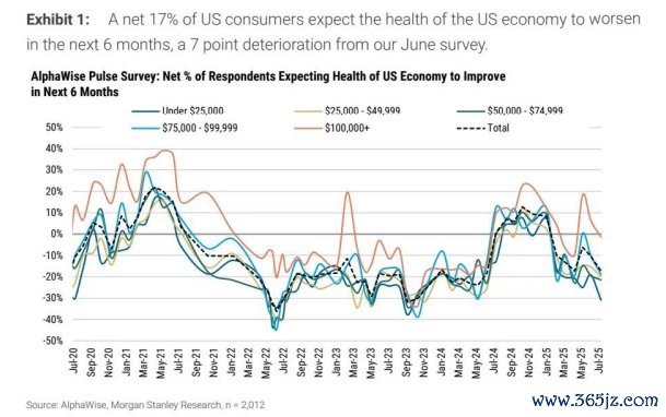 摩根士丹利7月24日至28日开展的AlphaWise好意思国滥用者探望暴露,好意思国滥用者对经济长进的魄力愈发严慎。滥用者净情谊环比下落7个百分点至-17%,这是继上月下落4个百分点后的又一次下滑。对家庭财务景象的信心也在7月放松,环比下落6个百分点至+10%。