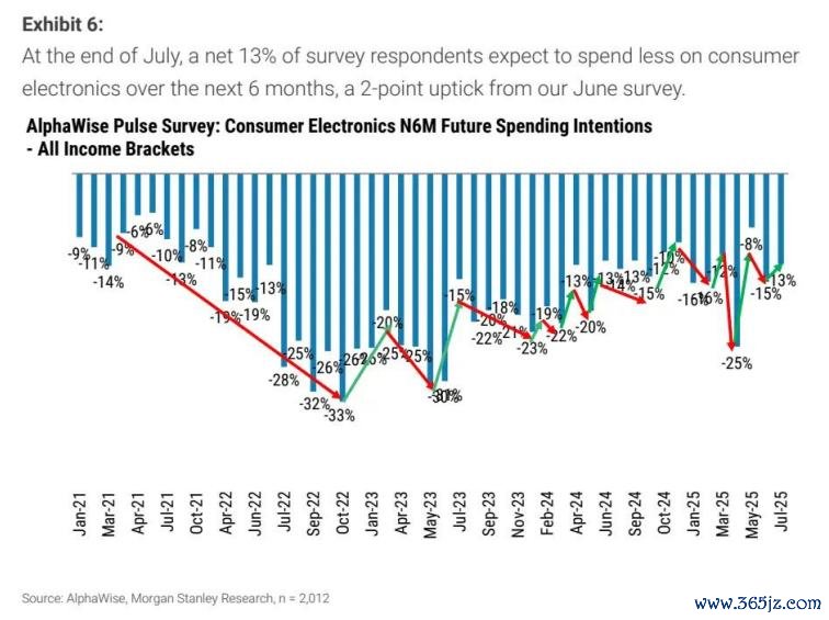 摩根士丹利发表研报默示,在合座商场情谊偏向负面的配景下,7月好意思国滥用者电子产物支拨意向环比略有上涨,但仍处于负值区间。这一信号为滥用电子行业长进蒙上暗影,分析师警告称,返校季需求疲软和抓续恶化的宏不雅情谊可能压制行业复苏。 摩根士丹利7月24日至28日开展的AlphaWise好意思国滥用者探望暴露,好意思国滥用者对经济长进的魄力愈发严慎。滥用者净情谊环比下落7个百分点至-17%,这是继上月下落4个百分点后的又一次下滑。对家庭财务景象的信心也在7月放松,环比下落6个百分点至+10%。 这种情